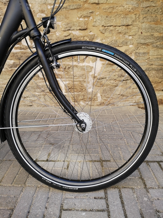 - Torkekindlad rehvid:- Schwalbe Marathon plus rehvid, valmistatud Saksamaal. Tavakasutusel saab nendega sõita 10 000 km. Oleme neid kasutanud rendiratastel juba üle 10 hooaja ja kiidame igati. Torkekindluse tagab paks kummisegu, mis on ka värvitud siniseks, et saab kohe aru kui rehv on juba mõistlikkuse piirini kulunud. Sellised rehvid maksavad jaemüügis 40+ eurot tükk.
